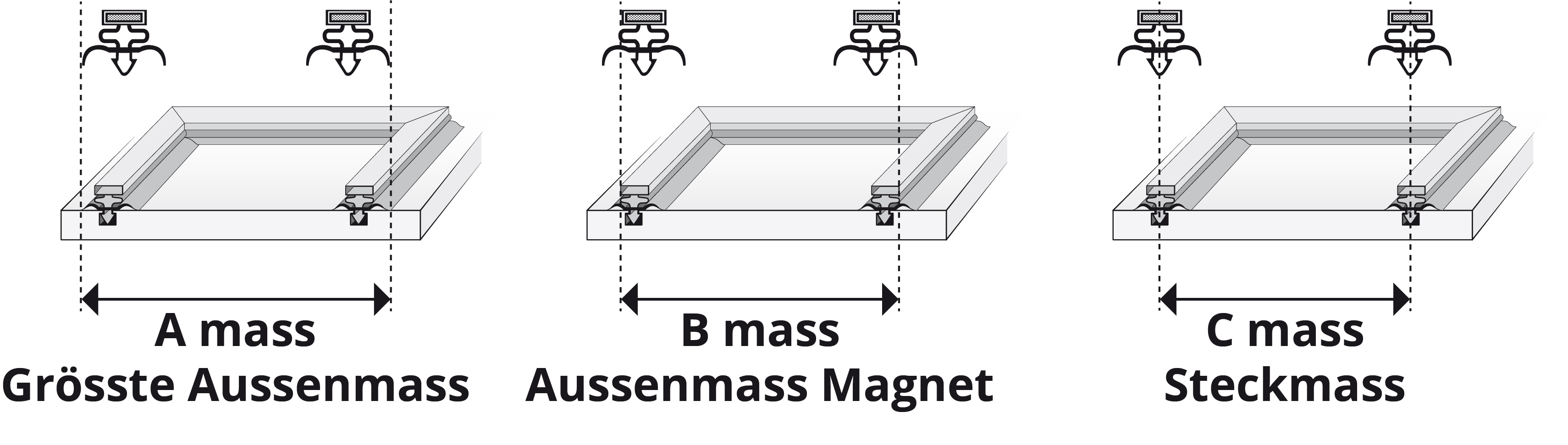 Größte Außenmaß (A Maß) Außenmaß Magnet (B Maß) SteckMaß (C Maß)