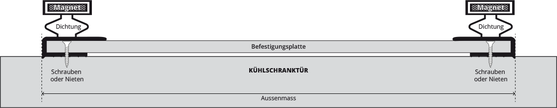 Zur Befestigung der Eindruckdichtungen wird in Türen und Schubladen ein Hartplastikstreifen verwendet, dessen Abmessungen (Breite und Tiefe der Nut) genau auf die Grösse der verwendeten Eindruckdichtung abgestimmt sind. Dies gewährleistet, dass die Dichtung bei der Montage oder beim Austausch einer defekten Dichtung leicht zu montieren ist.